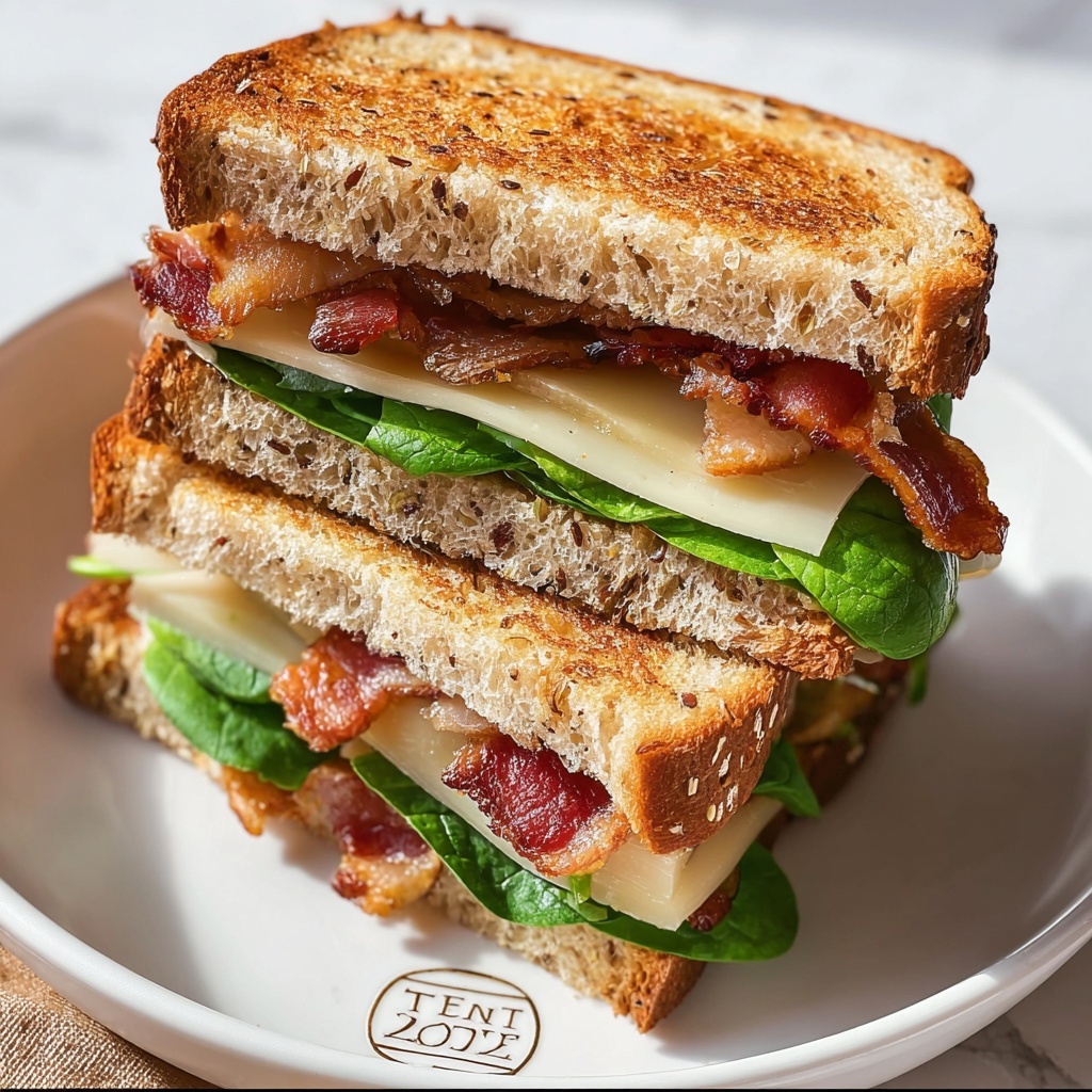 A delicious and comforting Bacon Gouda Sandwich combining crispy bacon, melted smoked Gouda cheese, fresh baby spinach, and a hint of honey mustard, all toasted to golden perfection on sourdough bread.