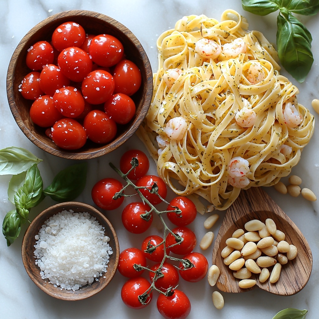 Each ingredient in this recipe plays a crucial role in balancing flavor, texture, and color, creating a pasta dish that feels fresh and indulgent all at once. From the luscious shrimp to the aromatic pesto and bright roasted tomatoes, the simplicity is what makes it unforgettable.