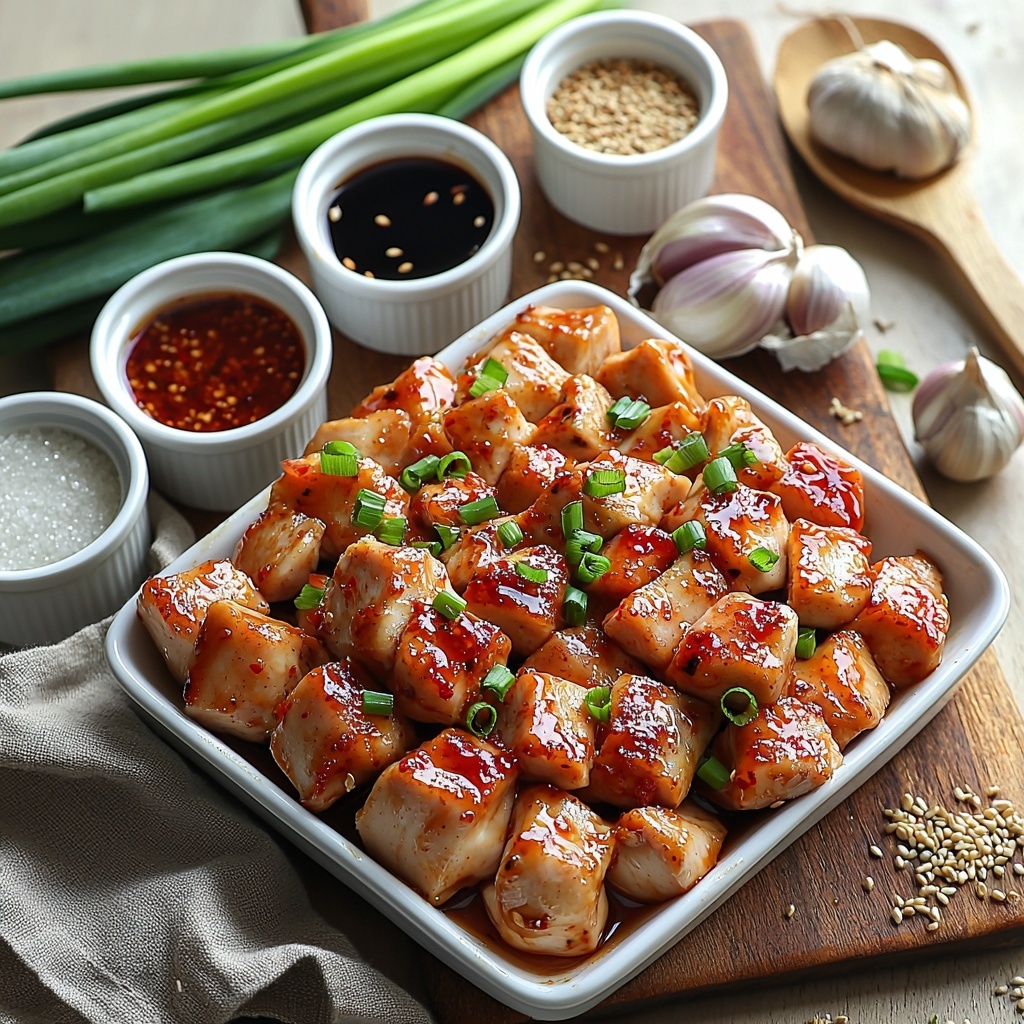 This Chili Garlic Chicken recipe is a flavorful, spicy Asian-inspired dish featuring tender chicken pieces tossed in a savory and garlicky sauce. Perfect for a quick weeknight dinner, it combines the heat of chili garlic sauce with the umami of soy and oyster sauces, garnished with fresh green onions and optional sesame seeds. Serve it hot over rice or noodles for a satisfying meal.