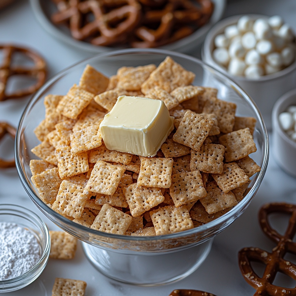 Start by pouring your Rice Chex cereal into a large mixing bowl and setting it aside. This will be the crunchy canvas that holds all the delicious coating later on.