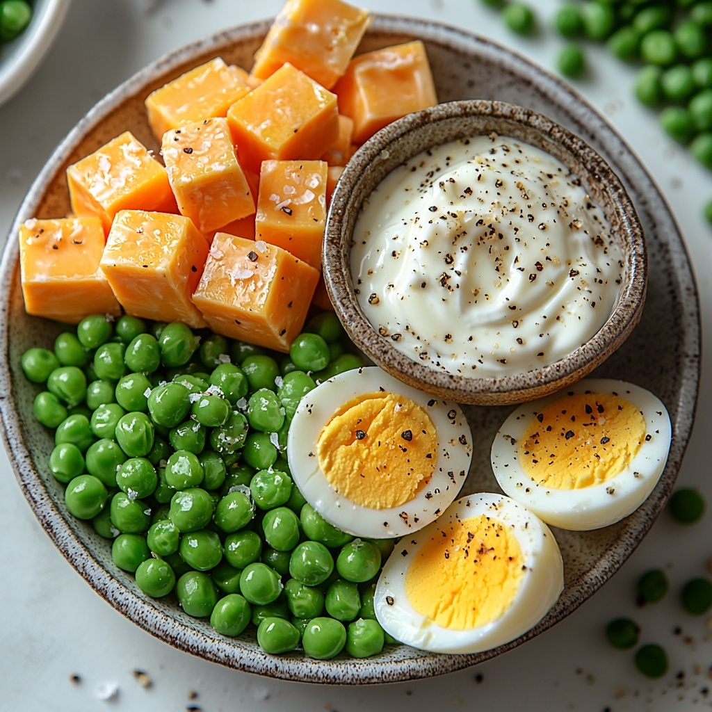 2. Combine Salad Ingredients: In a medium bowl, add the slightly thawed peas, cubed cheddar cheese, chopped red onion, and diced hard-boiled egg if using. Mix the ingredients gently to combine.