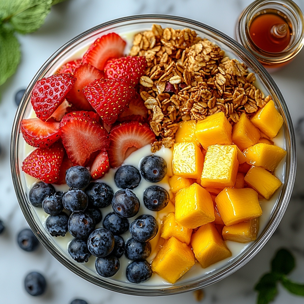 Scatter a colorful mix of sliced strawberries, blueberries, and diced mango or peaches over the granola. This adds juicy sweetness and an eye-catching burst of color that makes your parfait look as good as it tastes.