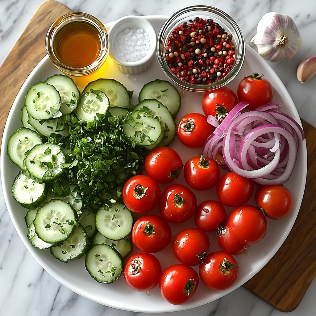 Getting the ingredients right is crucial for crafting the perfect Greek Cucumber Tomato Salad Recipe. Each component is simple but plays a vital role: the crisp cucumber adds crunch, juicy tomatoes bring sweetness, and the herbs and dressing tie everything together with that unmistakable Mediterranean flair.