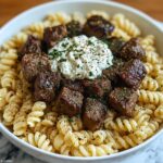 To reheat, warm the creamy pasta gently on the stove over low heat, stirring occasionally to prevent the sauce from splitting. Heat the steak bites separately in a skillet to refresh their crisp sear, then combine everything just before serving for the tastiest experience.