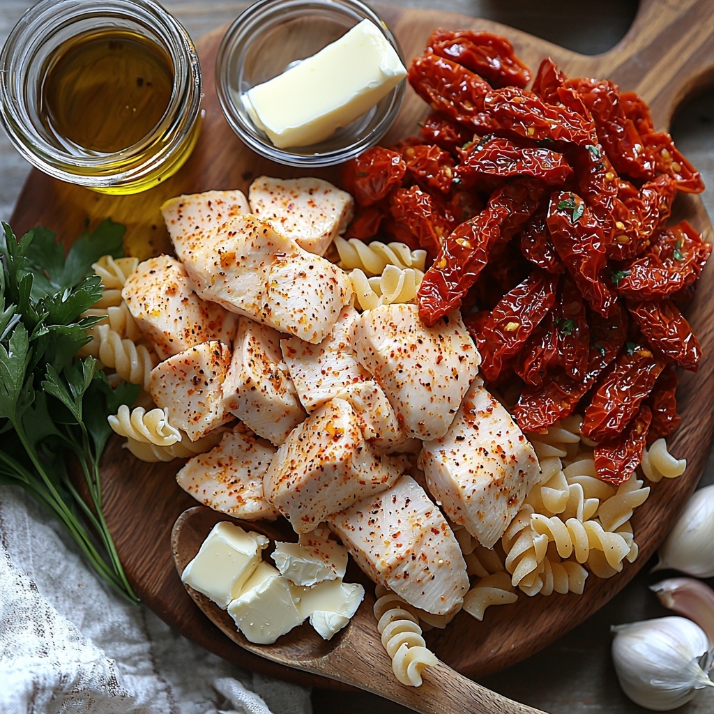 4. Prepare the Sauce: Using the same skillet, sauté minced garlic until fragrant, about 1 minute. Add sun-dried tomatoes and pour in the heavy cream. Simmer gently for 5 minutes to allow flavors to meld.