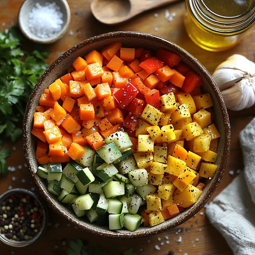 Begin by preheating your oven to 425 degrees Fahrenheit (220 degrees Celsius), the perfect temperature to caramelize your veggies to golden perfection. Toss together your carefully chopped carrots, zucchini, red bell pepper, yellow onion, and minced garlic with olive oil, dried thyme, salt, and pepper. The olive oil coats each piece to ensure even roasting, while the thyme and seasonings start the flavor layering right in the oven.