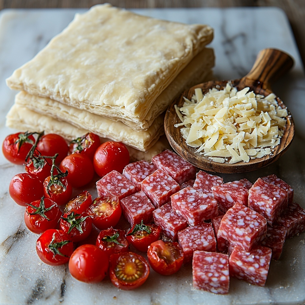 - Top the Pastry: Dice the salami into small pieces and scatter them evenly over the pastry. Next, arrange the thinly sliced cherry tomatoes on top in an even layer. Finally, sprinkle 3 tablespoons of grated Parmesan cheese over everything for a savory, cheesy finish.