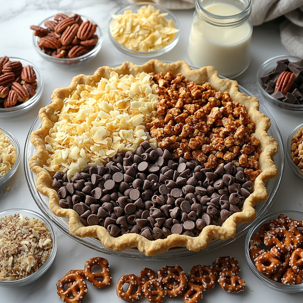 - Mix Filling Ingredients: In a large bowl, combine the sweetened condensed milk, semi-sweet chocolate chips, toffee bits, crushed pretzels, shredded sweetened coconut, and chopped toasted pecans.